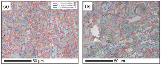 EBSD mappings with 1400 × 1050 points were recorded using an acceleration voltage of 16 kV, a step size of 200 nm, and a pattern acquisition time between 55 and 62 ms. EBSD evaluation was conducted using in-house written software. The grains were identified as areas enclosed by grain boundaries with a misorientation angle ≥5°. The grain size was calculated as the equivalent circle diameter from the averaged grain area. Grains with less than 5 pixels (diameter < 0.5 µm) were not considered for grain size determination.