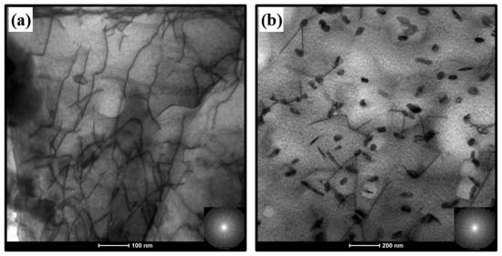 At steady state, the left-hand sides of Equations (12) and (13) are equal to 0. Gv and Gi are generation rates of free vacancies and interstitials due to irradiation, both are proportional to the dose rate. R is the recombination parameter, which is related to the diffusivity of vacancies and interstitials, Dv and Di, respectively. Kv and Ki represent the reaction parameter of vacancies and interstitials absorbed by sinks. Kv and Ki are related to the diffusivities Dv and Di and sink strengths for both defects. The second term on the right-hand sides describes the recombination of vacancies and interstitials. The third term quantifies the point defect absorption by sinks. An increase in dose rate increases the generation rate of point defects (first term) but does not change the second and third term. Thus, the total concentration of point defects at a steady state will also increase with increasing dose rate. Irradiation-induced point defects are the source of dislocation loops. Therefore, at comparable dose levels, ion irradiation with a higher dose rate gives rise to a higher number density of dislocation loops than neutron irradiation, which qualitatively explains the experimental results obtained in the present study. A quantitative description of dose rate effects on the number density of loops would require a more complete rate theory model [47], which is beyond the scope of the present study.