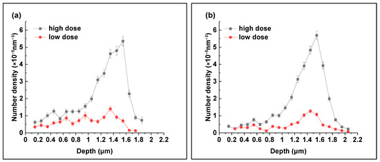 Measured depth profile of number density of loops for samples (a) ANP-6, (b) ANP-10.