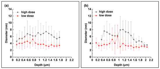 Measured depth profile of size of loops in diameter for samples (a) ANP-6, (b) ANP-10.