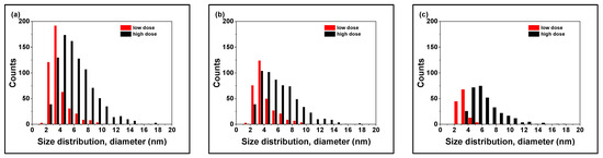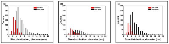 The number densities of loops at the peak position are higher for the high dose as compared to the low dose. The factors are 3.9 and 4.5 for ANP-6 and ANP-10, respectively. The average size of loops is slightly larger for the high dose as compared to the low dose for both materials.