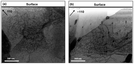 For (S)TEM, a Talos 200 FEG TEM (FEI, Eindhoven, Netherlands) was applied to image dislocations and to measure dislocation density. The thickness was measured by the acquisition of convergent beam electron diffraction (CBED) patterns at <211> bands and a subsequent comparison of experimental and simulated CBED patterns. CBED simulations were carried out by the software TEMStrain 1.4 (Kraków, Poland) by A. Morawiec. In order to measure the dislocation density, grains were oriented to either <113> or <001> zone axis for STEM imaging. The correct orientation was confirmed by both, conventional selected area diffraction (SAD) as well as CBED patterns. Imaging on these zone axes allows the visibility of most dislocations with ½ <111> and <001> type Burgers vectors that exist in bcc structural materials. After imaging dislocations, the thickness of each corresponding grain was measured. The grain was tilted so that the direct beam was aligned with a <211> type Kikuchi band. Through tilting, the grain orientation was adjusted so that one Kikuchi line was crossing the center of the transmitted disc, while the complementary Kikuchi line was crossing the center of the diffracted disc. These experimental CBED patterns were then compared to simulated CBED patterns. The rocking curve in these patterns is very sensitive to changes in sample thickness. Thus, the accuracy of this method for measuring sample thickness at a single point is approximately 5 nm or better. However, the thickness is not always constant over the whole grain. If a thickness gradient was noticed, several points of thickness measurement were taken and an average grain thickness was determined. After imaging of dislocations and thickness measurement, the line intercept method was applied to calculate the dislocation density for each grain. Since a mere gray-value-based recognition of STEM images of dislocations did not work reliably, the dislocations were marked manually. In the next step, in-house written software was used to draw vertical and horizontal lines with a spacing of 10 image pixels. The total number of intercepts N with dislocation lines was counted automatically. Ambiguous areas were excluded. Finally, for each grain, the dislocation density ρ was calculated as: