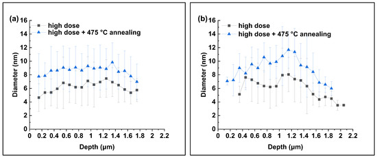 Depth profiles of loops diameter in ion-irradiated (high dose) and subsequently annealed at 475 °C (a) ANP-6, (b) ANP-10.