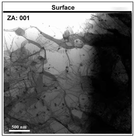 After both materials were ion irradiated, dislocation loops can be observed mostly as small black dots (approximate diameter < 10 nm), while rarely some appear as ‘‘real loops’’ (approximate diameter > 15 nm) in the STEM bright field images. Figure 9a,b and Figure 10a,b show examples of STEM images of ion-irradiated cross sections for sample ANP-6 (high and low doses) and ANP-10 (high and low doses), respectively. On the left-hand side of the STEM images, depth profiles of displacement damage and injected interstitials calculated by SRIM are attached. The most important feature is the damage band with a high density of dislocation loops located in the range from 1.2 to 1.6 µm below the surface, which overlaps with the depth range of maximum dose and injected interstitials. The band is clearly distinguished in the high-dose samples. While still present, it is less obvious in low-dose samples. In the depth range between the band and the surface, significantly fewer loops are present. They are distributed inhomogeneously and located preferentially in the vicinity of sinks (initial line dislocations, grain boundaries, and precipitates). The density of loops below the damage band decreases dramatically and loops are barely observed below a depth of approximately 2.0 µm, where the unirradiated substrate is located.