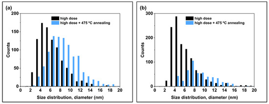 A comparison of the size distribution of loops before and after annealing is given in Figure 19. Loops with a diameter below 5 nm, which are dominant for the as-irradiated samples, almost completely disappear after annealing. The peak positions of the size distributions are shifted by around 4 nm toward higher diameters.