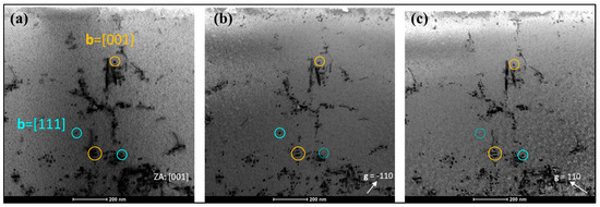 In bcc structural materials, dislocation loops are formed only with Burgers vectors b = <001> and b = ½ <111> [28]. According to the visibility criteria, loops are invisible under STEM images when g · b = 0. As shown in Table 3, specifically under diffraction condition g = <110>, half of b = ½ <111> type, and one-third of b = <001> type loops are invisible. Therefore, the total number density of loops Nd lies between 1.5 Nc and 2 Nc [29], where Nc is the number density of loops counted and calculated under diffraction condition g = <110>. In the present work, Nd = 1.75 Nc is chosen with an error range of ±0.25 Nc.