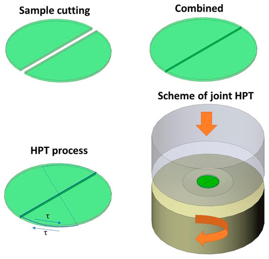 HPT was carried out using anvils with a diameter of 10 mm with a 0.5 mm deep groove, at a rotation speed of 1 or 0.5 rpm, under a calculated pressure of 6 GPa (the pressure calculation method is discussed below), at room temperature [25].