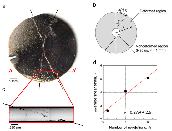 Procedure for observing the net shear strain γreal introduced by the HPT process. The net strain introduced by the HPT process was calculated by Equation (2) using the shear angle τ (θ).