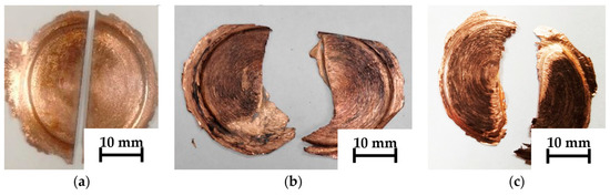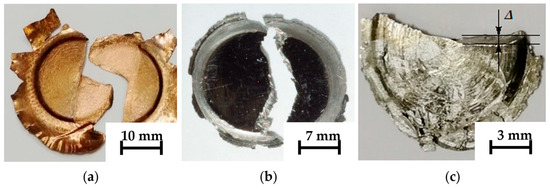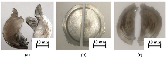 Images of the sample halves: (a) two halves of pure Cu after joint HPT for n = ¼ revolutions; (b) two halves of the Vit105 BMG after joint HPT for n = 1 revolution; (c) a half of the BMG after joint HPT for n = 5 revolutions [25].