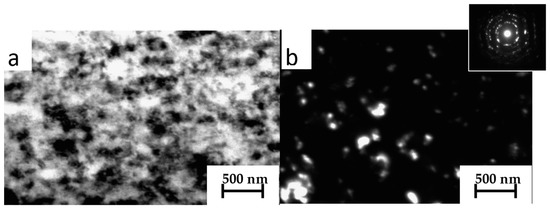 Structure of Ti after HPT n = 10: (a) bright field; (b) dark field with an electron diffraction pattern [28].