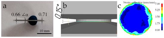 The case with this deformation pattern was reproduced using a finite-element computer simulation using the Deform 3D software package (Figure 8b) [28]. As in the real experiment, a CP Ti sample with d = 20 mm and h = 0.6 mm was taken for modeling. The material was assumed to be plastic and isotropic; it had no initial stresses and strains, and the anvil was specified as an absolutely rigid body.