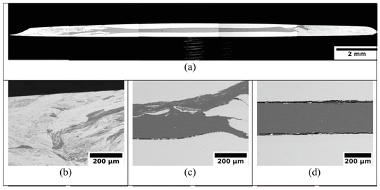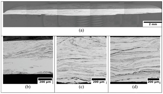Cross-section of the Cu–Al–Cu metal matrix composite after accumulative HPT at a lower magnification (a) and the zone of the edge (b), mid-radius (c), and center (d) at a higher magnification [54].