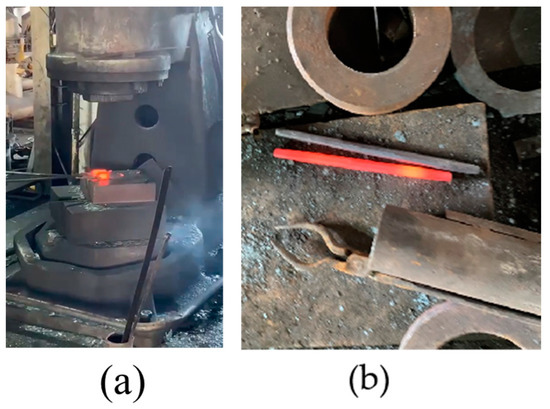 Figure 2. (a) Forging process of 600 g steel sample, and (b) pictures after forging. - (7)