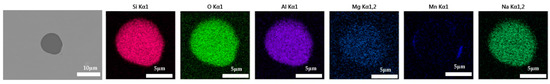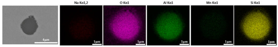 The 600 g steel sample without Na2CO3 added during the resistance furnace experiment process was analyzed by SEM-EDS, and the typical inclusion is shown in Figure 3. The scanning results of the inclusions in the steel sample with 0.3%, 0.5% and 1.0% Na2CO3 added are shown in Figure 4, Figure 5 and Figure 6, respectively. After adding alkali carbonate, the content of calcium in the inclusions in the sample decreased significantly (CaO from 15% to 8%). And with the increase in Na2CO3 content, the content of Na in the inclusions also increased significantly (Na2O from 0% to 6%). After comparing the inclusions obtained by SEM analysis between the blank samples and the samples with a different alkali metal to sodium carbonate, it was found that the size of the inclusion did not change significantly with the increase in the amount of sodium carbonate, but only increased slightly.