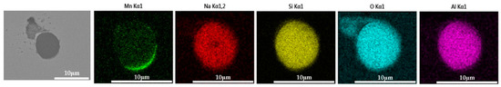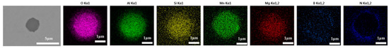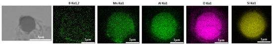 The 600 g steel sample with 0.3% and 1.0% B2O3 added during the resistance furnace experiment process was analyzed by SEM-EDS, and the typical inclusions are shown in Figure 11 and Figure 12, respectively. When the amount of B2O3 was small, the inclusions were boron-free inclusions in the SiO2-MnO-Al2O3 system. When excessive B2O3 was added, the inclusions were composite inclusions with SiO2-MnO-Al2O3 as the core and BN wrapped around. The boron element could not be incorporated into the original inclusion of SiO2-MnO-Al2O3 when adding a small amount or an excessive amount B2O3, so adding B2O3 could not reduce the melting point of the inclusion and could not effectively modify it.