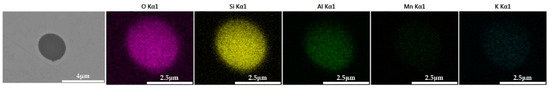 The 600 g steel sample without K2CO3 added during the resistance furnace experiment process was analyzed by SEM-EDS, and the typical inclusion is shown in Figure 7. The morphologies of the samples with 0.3%, 0.5% and 1.0% K2CO3 in the steel are shown in Figure 8, Figure 9 and Figure 10, respectively. After adding alkali carbonate, the calcium content in the inclusions in the sample decreased significantly (CaO from 15% to 8%). And with the increase in K2CO3 content, the content of K in the inclusions also increased significantly (from 0% to 6%). After comparing the inclusions obtained by SEM analysis between the blank samples and the samples with a different alkali metal to K2CO3, it was found that, similar to the addition of Na2CO3, the size of the inclusion in the sample with the addition of K2CO3 did not change significantly with the increase in potassium carbonate, but only increased slightly.