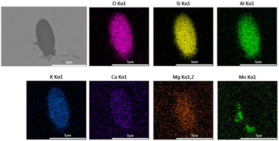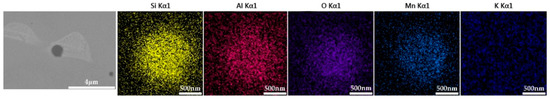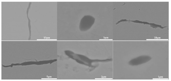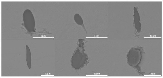 Inclusions were observed in the longitudinal section of a 600 g forged bar in Figure 2, and the deformation of the inclusions after forging is shown in Figure 19 and Figure 20, which shows obvious deformation behavior. It can be seen from Figure 19 that after the addition of K2CO3 to the cord steel, the inclusion changed from spherical to a strip after forging. However, compared with the addition of Na2CO3, the deformation ability of the inclusion with K2CO3 was lower, and the deformation was not obvious. Adding potassium carbonate to cord steel could reduce the melting point of inclusions, and most inclusions were deformed during hot forging, but there were still a few inclusions that were not easy to deform. Among the 30 inclusions observed, 20 inclusions had obvious deformation and 10 inclusions had no obvious deformation. It could be seen from the distribution of inclusions in Figure 14c and Figure 19 that most of the inclusions in the phase diagram of MnO-Al2O3-SiO2-K2O were located in the low melting point region, but there were still a few inclusions in the high melting point region. Adding potassium carbonate could improve the deformation behavior of inclusions during hot forging to some extent; most inclusions were easy to deform and a few were not easy to deform.