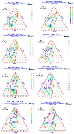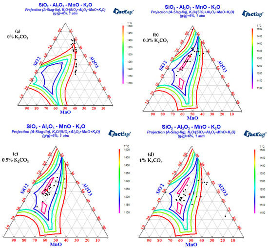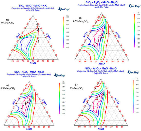 The influences of different K2O and Na2O contents on the low melting point region of SiO2-MnO-Al2O3 inclusions were calculated by Factsage 8.1, as shown in Figure 16. It can be seen that the low melting point region of SiO2-MnO-Al2O3 inclusions expands in varying degrees with the increase in alkali metal content. Among the inclusions with the same alkali metal content, Na2O had a better expansion effect on the low melting point region of SiO2-MnO-Al2O3 inclusions than K2O. At the same time, with the increase in Na2O, the melting point of SiO2-MnO-Al2O3 inclusions was lower. When the mass fraction of K2O in inclusions increased from 6% to 9%, the melting point region of inclusions below 1200 °C was divided into two parts, and the composition control region was narrowed, which was not conducive to the control of the low melting point region of the inclusions.