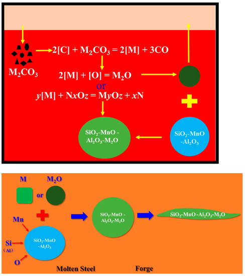 Modification and deformation mechanism of SiO2-MnO-Al2O3 inclusions by Na2CO3 and K2CO3.