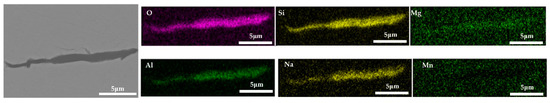 Inclusions were observed in the longitudinal section of a 600 g forged bar in Figure 2. The deformation of the inclusions after forging is shown in Figure 17, and the distribution of each element in the inclusions is shown in Figure 18, which shows obvious deformation behavior. It can be seen from Figure 17 that when Na2CO3 was added to the cord steel, after forging the inclusion changed from spherical to a long strip as cast, and has good deformability. Adding sodium carbonate to cord steel could significantly reduce the melting point of the inclusions, and almost all inclusions were deformed during hot forging. Among the thirty inclusions observed, twenty-seven inclusions had obvious deformation, and three inclusions had no obvious deformation. It could be seen from the distribution of inclusions in Figure 13c and Figure 17 that almost all inclusions in the phase diagram of MnO-Al2O3-SiO2-Na2O were located in the low melting point region. Adding sodium carbonate could significantly improve the deformation behavior of inclusions during hot forging.