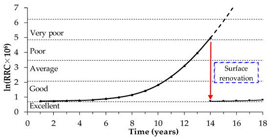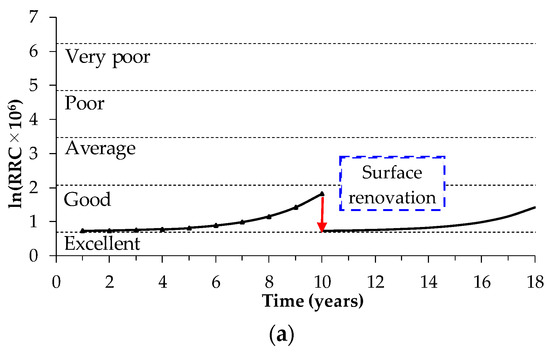 In this context, with the purpose of contemplating the pavement’s progressive deterioration, Paterson and Attoh-Okine [30] developed a model considering the International Roughness Index (IRI) with values at any time after starting the road surface service, which is calculated by Equations (15) and (16):