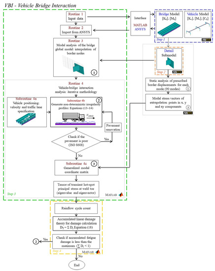 The dynamic vehicle–structure interaction and the pavement’s progressive deterioration could be considered in the process of the fatigue damage evaluation carried out in the present research, taking into account the development of the computational tool VBI, which has an efficient algorithm for modelling and simulating this type of interaction. The automation of this analysis process was carried out with the help of complementary programs. The VBI tool code was developed in a MATLAB [15] environment in order to access the finite element simulation functionalities, and it interacts precisely with the ANSYS [16] program through command scripts.