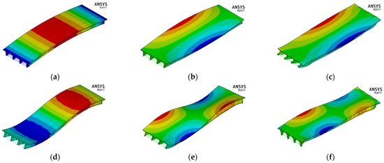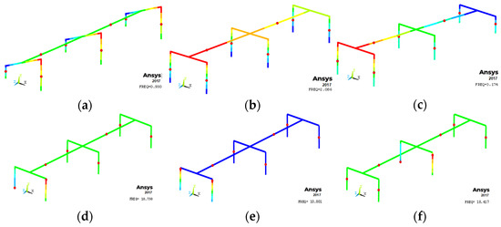 where n is the n-th vibration mode of the structure, and [M], [K] and [C] are the mass, stiffness and damping matrices, respectively. Therefore, after solving the equilibrium equations, the modal coordinates are calculated ( y ¨ n(t), y ˙ n(t) and yn(t)) and, through the principle of the superposition of effects, the total responses in real space are equal to the sum of the contribution of the responses of the n modes in modal space, as shown in Equations (8)–(10):