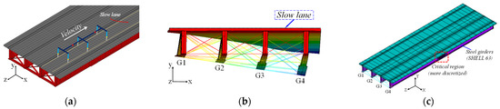 In this scenario, evaluating the dynamic effects of vehicles on steel and composite highway bridges becomes extremely necessary. However, bridge design has been traditionally carried out through static or quasi-static analyses, considering equivalent loads based on design standards with a dynamic amplification factor, which conservatively simulates the dynamic effects of vehicle traffic [1,2]. Therefore, in recent years, many studies have been conducted with the aim of improving the provision of design standards.
