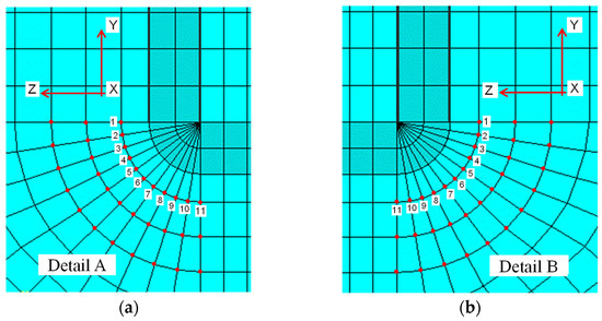 Figure 14. Front view of the submodel: hot-spot extrapolation paths around the corners: (a) Detail A (closest to the mid-span); (b) Detail B (farther away from the mid-span).