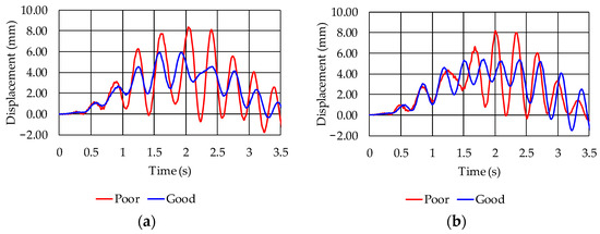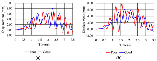 This section presents the results of the comparison of displacements obtained based on the dynamic analysis with the vehicle–structure interaction at mid-span considering two different roughness conditions, good and poor, taking into account a single three-axle vehicle crossing at ν = 40 km/h (Figure 15 and Figure 16).