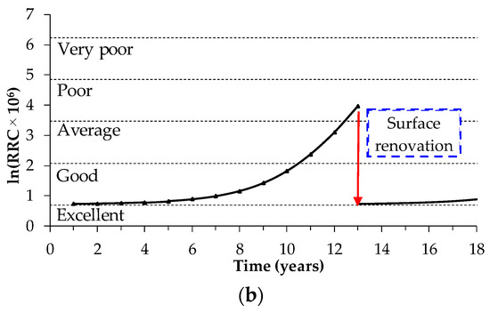 Figure 17. Surface renovation examples: (a) RRCrenewal limit = 4 × 10−6; (b) RRCrenewal limit = 64 × 10−6.