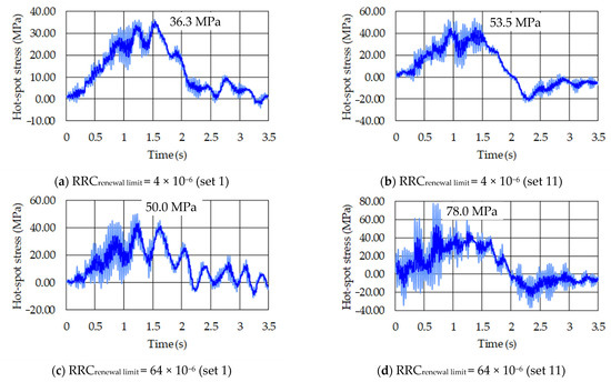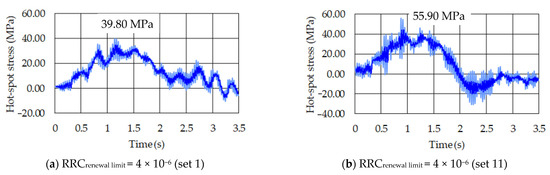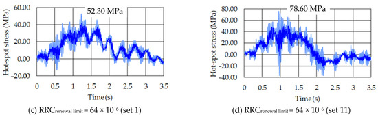 Thus, in relation to these values of out-of-plane hot-spot stresses obtained in the weld in the most critical component due to the crossover of the standard fatigue vehicle (ν = 40 km/h) considering the worst direction (set 11), the calculated results were 53.5 MPa and 78 MPa for Detail A, respectively, for RRCrenewal limit values of 4 × 10−6 and 64 × 10−6. On the other hand, for Detail B, still considering the worst direction (set 11), the calculated results were 55.90 MPa and 78.60 MPa for RRCrenewal limit values of 4 × 10−6 and 64 × 10−6, respectively.