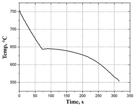 Liquidus temperature of the alloy was measured to be about 640 °C. To this end, about 400 g of the alloy was melted in a ceramic crucible placed inside a muffle furnace, and its temperature-time variations during cooling was recorded a few times using calibrated K-type thermocouples and a data acquisition system. A typical cooling curve is shown in Figure 1. The density of the cast alloy was measured as 2.8 g/cm3 using the Archimedes’ method.