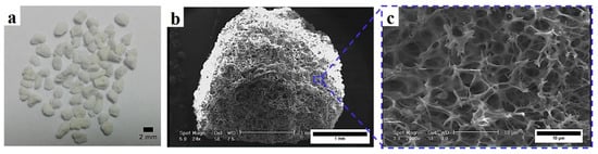 (a) Macrograph of EPPs, and SEM micrographs of (b) a typical EPP and (c) porosities on its surface.