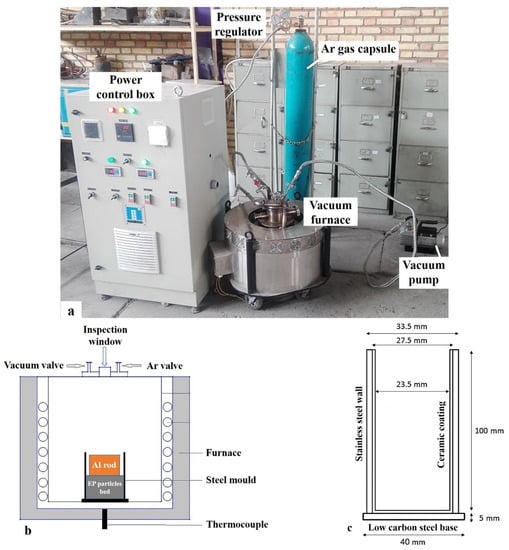 (a) The vacuum melting/pressure infiltration set-up, and schematics of (b) the furnace and (c) the refractory-lined steel moulds used in the experiments.