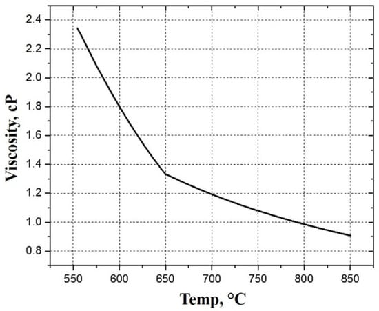 The influence of infiltration temperature on the viscosity of molten Al-4.3wt.%Cu, as extracted from the ProCAST software, is shown in Figure 4. It is obvious that the melt viscosity reduces by increasing the infiltration temperature. For instance, the viscosity of the molten alloy at 750 °C is about 10% less than that at 700 °C. This would result in improved fluidity of the melt and less demanding infiltration in the porous medium.