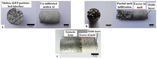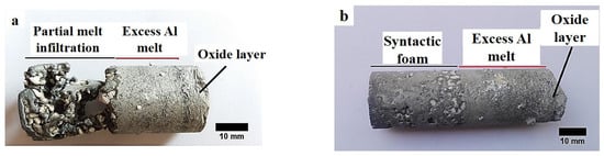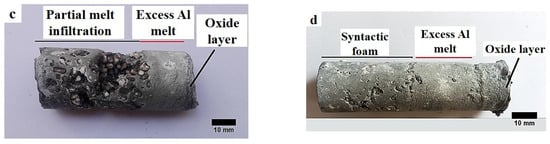 Complete infiltration was achieved at an infiltration temperature of 750 °C at infiltration pressures of 1.5 and 2 bars (Figure 7b,d). The fabricated samples are composed of two different sections, i.e., an Al-4.3wt.%Cu-EP syntactic foam and the excess melt on top of the foam.