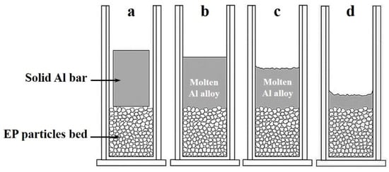 Schematics of the steps in preferential melt infiltration of the EPPs bed: (a) before melting of the aluminum bar, (b) just after melting of the aluminum bar, (c) preferential infiltration of the melt between the mould wall and the EPPs bed and (d) full infiltration.