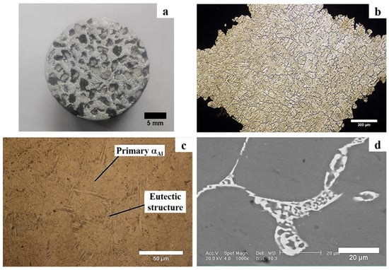 Macro and microstructures of the sample F0.8-750 were investigated by OM and SEM. A typical structure is shown in Figure 8. A macrograph of a cross section of the sample is shown in Figure 8a, where uniform distribution of EPPs in the matrix as well as some dark phases at their interfaces are visible. The microstructure of a strut junction between four EPPs is shown in Figure 8b,c which consists of light colour primary aluminium α phases and a darker eutectic structure at the boundaries of the primary phase. The eutectic structure (Figure 8d) consists mainly of a eutectic aluminium α phase and un-equilibrium Al2Cu precipitates.