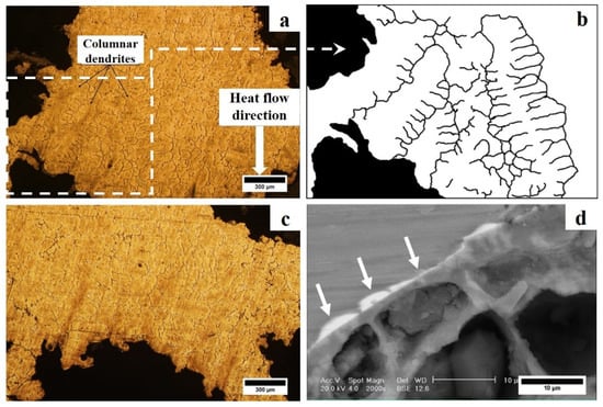 Despite the directional cooling of the sample, evidence of extensive directional solidification was not observed in the microstructure. The heat flow direction as well as some columnar dendrites grown opposite to the heat flow are displayed in Figure 9a. Schematics of some of these dendrites are shown in Figure 9b. No such dendrites could be observed in the upper parts of the sample (such as in Figure 9c). It is believed that the directional growth of the dendrites nucleated at the bottom of the mould is hindered by EPPs due to the mechanical and thermal effects of EPPs’ presence. Firstly, the dimension of the EPPs is many times larger than the grain size of the struts. As a result, EPPs can mechanically stop the directional growth of the grains. Secondly, the thermal properties of the EPPs and the aluminium matrix alloy are very different. The thermal conductivity of EP (0.12 W/m·K) is much lower than that of the matrix alloy (85 W/m·K) []. Furthermore, the specific thermal capacity of the former is 1000 J/kg·K, and that of the latter is 850 J/kg·K []. These differences result in slower cooling of the melt close to the EPPs. Interference of the thermal fields around each EPP with the thermal gradients imposed by the directional cooling is believed to prevent extensive growth of the columnar dendrites opposite to the cooling direction. In fact, the formation of a considerable number of eutectic phases on the EPP/aluminium matrix interface (marked by white arrows in Figure 9d) suggests that grains were nucleated in the bulk of the infiltrated molten alloy and grew towards the EPPs. Since the solute distribution coefficient of the Al-Cu system (k0) is less than unity [], copper atoms are rejected from the solidification front and are concentrated in the last part of the structure which is solidified. A directional solidification from the centre of the struts towards the EPPs can be concluded from Figure 9d. Such a growth mode would naturally result is equiaxed rather than columnar grains.