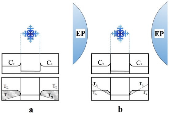 It is believed that in the solidification of metal syntactic foams, the growth of the equiaxed dendrites sets off similarly. However, very soon the thermal influence of the EPPs will induce a positive thermal gradient and remove the thermal share of the undercooling in front of the growing particles (Figure 10b). As a result, only the constitutional part of the undercooling remains for inducing instability in the solid-liquid interface; hence, less branched and less complex equiaxed grains in the metal syntactic foams.