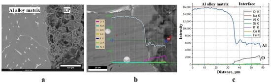 EDS line analysis across the interface of an EPP/aluminium alloy matrix is displayed in Figure 11b. Despite the rapid decrease in aluminium concentration when crossing the interface into the EPP, a considerable amount of aluminium is still detected, which points to Al2O3 as the dominant oxide phase in the interface zone. Similar results were observed for samples processed at 725 °C. The similar results have also been shown with other types of porous fillers like SiO2 glass preform [], fly ash [], and Al2O3-SiO2 ceramic microspheres [,]. XRD and EDS analyses suggested some chemical reactions at the interface of EPPs with the molten aluminium alloy, resulting in the limited reduction of oxide compounds of the EPPs.
