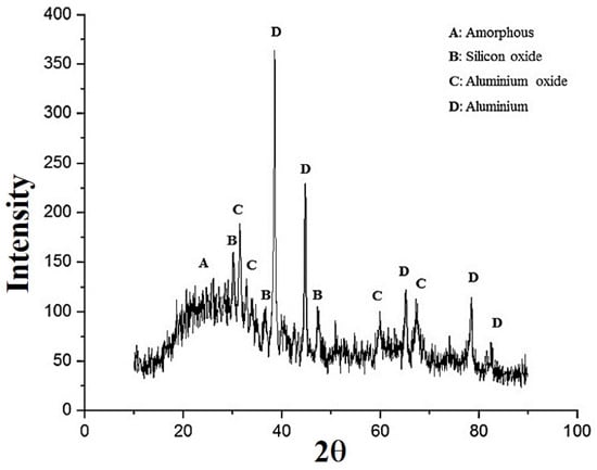Finally, any possible reaction between the EPPs and the aluminium matrix would improve the binding of the EPP/aluminium alloy matrix. To examine this, EDS and XRD analyses of the interfaces between the two were performed (Figure 11 and Figure 12). The visual detection of a black phase at the interface of some EPPs was mentioned in Figure 8a. Attempts were made to characterize this phase by XRD analysis of a small amount of the phase carefully scratched from the cross section of the sample. The result shown in Figure 12 suggests the presence of the EP amorphous constituents, aluminium, Al2O3, and SiO2. The aluminium is most likely wear debris from the matrix. SiO2 is thought to be due to the crystallization of some of the constituent amorphous silica in the EPP, and Al2O3 may be due to the reduction of oxide constituents of EPP by molten aluminium according to thermodynamically favourable reactions, like those below [,,,]: