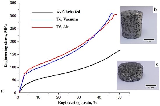 Typical engineering stress-strain curves for as-fabricated and heat-treated F0.8-750 syntactic foams, as well as macrographs of a compression test sample before and after compression test are shown in Figure 14. Clearly, the curves comprise three classic regions of elastic, plateau, and densification regions. The compression properties of the as-fabricated and heat-treated F0.8-750 syntactic foams are tabulated in Table 3.