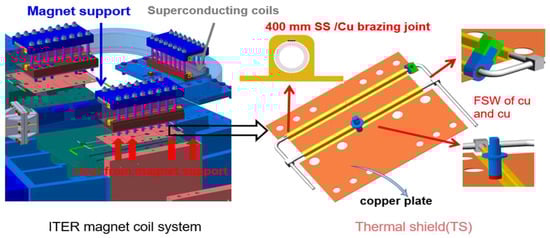 As a critical component of the superconducting magnet system, the 18 correction coils (CC) are used to compensate for field errors arising from the misalignment of the coils and winding deviations from the nominal shape as a result of fabrication tolerances, joints, leads, busbars and assembly tolerances [3]. In order to maintain the suitable operation of the ITER machine, the temperature of the CC superconducting coils shall be kept lower than the current sharing temperatures of 6–8 K to stay superconductive. Unfortunately, there was thermal disturbance, electromagnetic heat and eddy current heat generated by AC loss, etc. In addition, each magnet support that contacts the superconducting coils as a source of heat is approximately 16 kW during the normal and abnormal operation of the ITER tokamak, as shown in Figure 2, in order to intercept the heat from the magnet support to the superconducting coils. The thermal shield (TS), composed of brazed copper and 316L tubes, was located between the magnet support and the superconducting coils. Helium with a temperature of 12 K and pressure of 0.5 MPa was injected into the 316L SS tubes of TS, cutting off the heat from the magnet supports.