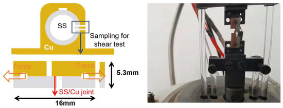 The microstructures of the brazed joints were observed via an optical microscope (ZEISS AXIO) and scanning electron microscopy (ZEISS EVO18 Special Edition) equipped with an energy-dispersive spectrometer (EDS). The samples were ground progressively with 200#, 400#, 800# and 1000# SiC sandpaper, and then polished with a diamond paste. A mixture of FeCl3:HCl:H2O = 5:20:100 was employed for etching the as-brazed joints before the optical microscope test (OM). A Vickers microhardness test was conducted via an HXD-1000TM hardness tester with a test load of 100 N and a holding time of 10 s for each point. The shear strength of the joints was sampled as shown in Figure 4. After that, the shear strength of the two as-brazed samples was examined by a bespoke micro-tensile test machine with a maximum tensile force of 1000 N at 0.2 mm/s cross-head speed. Subsequently, in order to have a better understanding of the fracture behavior during the shear strength test, the characteristics of the shear fracture surfaces were analyzed with the naked eye and SEM.