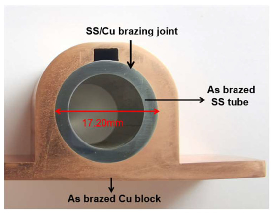 - The high, precise-depth drill of copper block employed in this paper ensured a favorable control of the brazing clearance for the SS/Cu joint, contributing to a 100% braze ratio for the long-length SS/Cu joints.