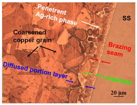 The macromorphology of the brazed joint is presented in Figure 5. It suggests that the as-brazed SS/Cu interface is smooth, without any porosity, cracks or dis-bonded areas. Figure 6 evaluates a high-resolution image of the Cu/SS steel-brazed joint by OM. The OM observation on the cross-section of the SS/Cu brazed joint reveals that the thickness of the interface is about 130–150 μm. Of note, the brazing joint is composed of a brazing seam center area with a thickness of approximately 10 μm, an interface area of the brazing seam layer with a thickness of about 20 μm and a diffused portion layer with a thickness of 100 μm. For the diffused portion layer, the primary crystal of Cu grows close to the Ni layer, due to the good wettability of Cu on the Ni layer. During the brazing activities, the molten filler materials infiltrated into the grain boundaries of the coarsened copper grains with a distance of 40–100 μm. This phenomenon is consistent with what was reported in the literature [13]. During the cooling process after brazing, the copper grew along the Ni layer that was formed by the nickel plating and the molten filler automatically flowing to the Cu grain boundary, resulting in the Ag-rich phase mainly distributed near the copper side after brazing.