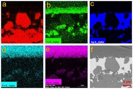 To further assess the detail of the joints, Figure 8 presents the EDS maps of the brazed joint. It was determined by the EDS that the brazing seam was composed of a Cu and Ag-rich phase. Furthermore, Ni atoms were present at the brazing seam, which means that the Ni layer was partially melted into the braze seam during the brazing thermal cycle. It is worth noting that the brazing temperature was 830 °C, which is lower than the melting point of Ni (1453 °C). This suggests that the molten liquid was a mixture of Ni, Cu and Ag. Additionally, it was revealed in Figure 7 that Fe and Cr atoms also diffused into the Cu base metal over a long distance during brazing. It is interesting to note that Fe and Cr atoms barely existed in the brazing seam. This was mainly due to the low solubility of Fe and Cr in Cu. On the other hand, there is no doubt that the solubility of the Fe and Cr in Ni was very high. Hence, it can be hypothesized that the Fe and Cr mainly dissolve into Ni, leading to the long-range diffusion of the Fe and Cr along with the Ni-Cu-Ag melt. The above results prove that the interdiffusion of Cu, Ni, Fe and Ag elements between substrates and filler metal is sufficient for good metallurgical bonding in the brazed joint.
