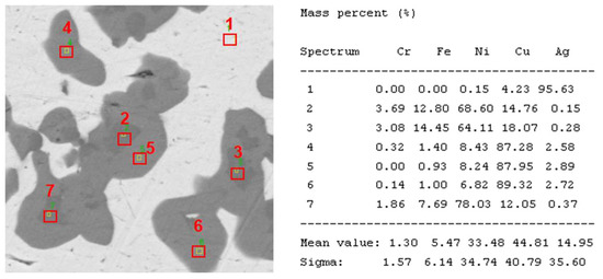 The EDS analysis of seven points of the brazing seam with different colors is shown in Figure 9. Point 1 is the Ag-Cu solid solution, in which the Cu content (4.23 wt.%) is lower than the composition (8.8 wt.%) of eutectic Ag-Cu (that is, the molten filler material). This implies that the Cu in the eutectic Ag-Cu may have diffused into the base material or other areas during cooling. In addition, the Cr and Fe dissolving into the Ni layer is proved by the composition of the dark area (points 2, 3 and 7). Furthermore, the solid solution formed by the Ni and Cu is also detected in the gray areas of point 5, point 6 and point 4. Of note, points 4, 5 and 6 have a lower content of Fe and Cr than point 7, point 3 and point 2, which suggests that the time for solidification in the gray area is later than that in the dark area, since the melt points of the Fe and Cr are much higher than that of the Cu and Ag.
